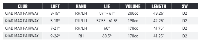 Le QI4D Max Fairway est conçu pour les golfeurs recherchant un bois facile à lancer grâce à une face plus plate et offrant une tolérance maximale. Sa tête massive de 200cc est 17 % plus grande que le modèle Tour et 5 % plus grande que le modèle standard, offrant un gain significatif en confiance. C’est notre “mini-mini driver”.